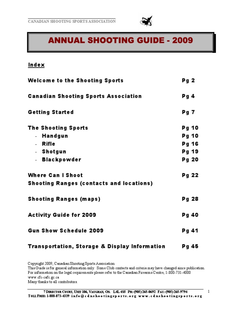 Copyright 2009, Canadian Shooting Sports Association This Guide is for general information only. Some Club contacts and criteria may have changed since publication. For information on the legal requirements please refer to the Canadian Firearms Centre, 1-800-731-4000 [Link] Many thanks to all contributors.