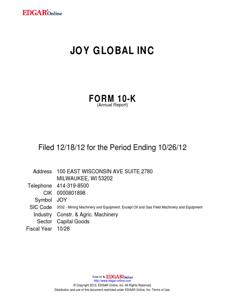 1. I have reviewed this annual report on Form 10-K of Joy Global Inc.;