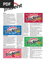 Trident is the gum that is usually at the bottom of the shelf at the checkout lane. Everyone knows about it but no one seems to be buying it. There are other brands including Orbit and 5 gum that are actively marketing to the target group while Trident is falling behind. Trident has been marketed as being good for your teeth but so is Orbit. In order to compete, Trident needs to re-brand their basic gum line to be eye catching and still true to their values of clean teeth. I suggest a new, larger package that has a flap with a comical, simple illustration with cutouts where the teeth should be. Underneath the illustration is a beautiful, clean, sparkly smile. Not only does this stay true to Tridents quest for clean teeth but is also eye-catching and humurous.
