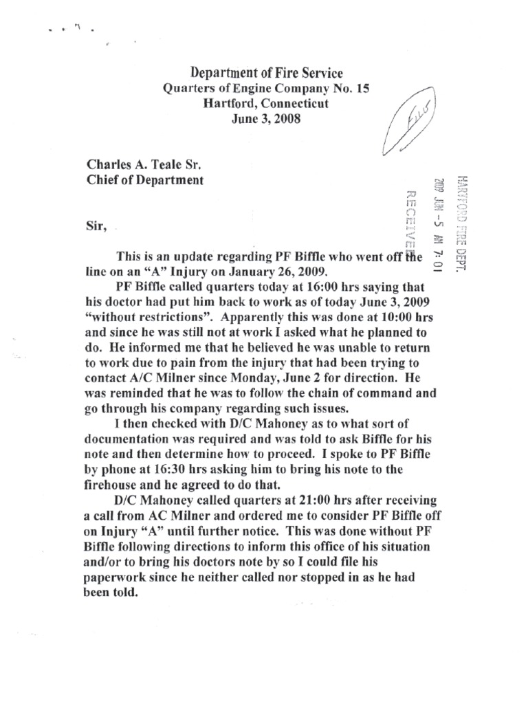 PF Biffle went off he line on an "A" Injury on January 26, 2009. PF Biffel called quarters today at 16:00 hrs saying that his doctor had put him back to work as of today June 3, 2009 "withou…