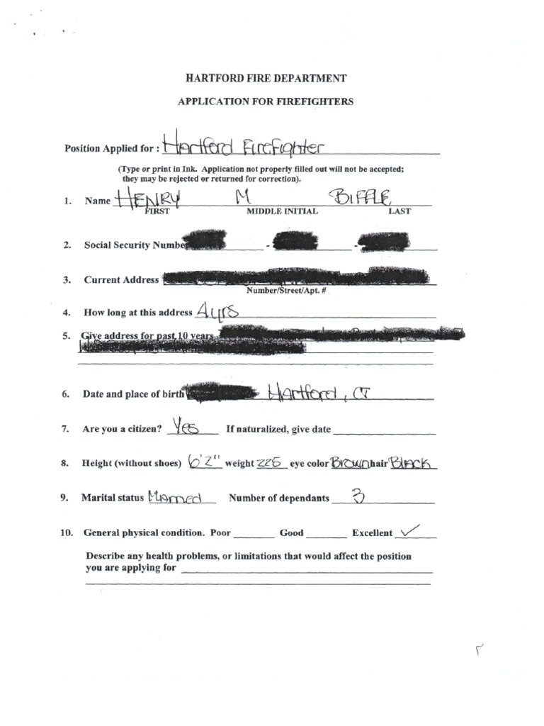 HARTFORD FIRE DEPARTMENT APPLICATION FOR FIREFIGHTERS Position Applied for: (Type or print in Ink) Describe any health problems, or limitations that would affect the position you are applyin…