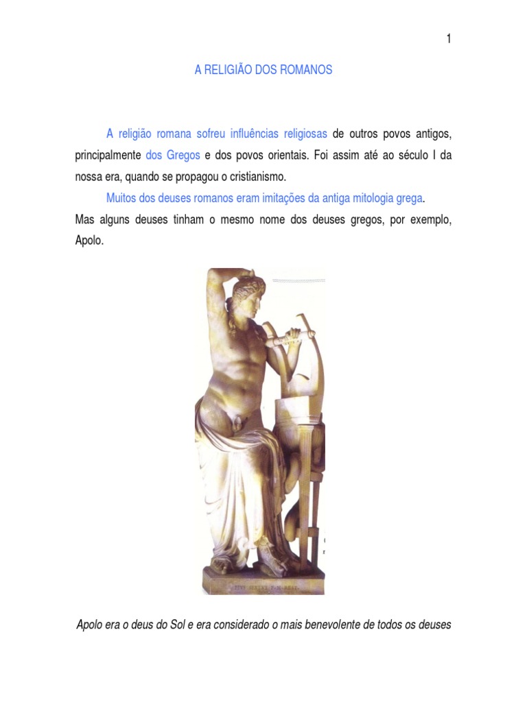 A religião romana sofreu influências religiosas de outros povos antigos, principalmente dos Gregos e dos povos orientais. Foi assim até ao século I da nossa era, quando se propagou o cristianismo. Muitos dos deuses romanos eram imitações da antiga mitologia grega. Mas alguns deuses tinham o mesmo nome dos deuses gregos, por exemplo, Apolo.