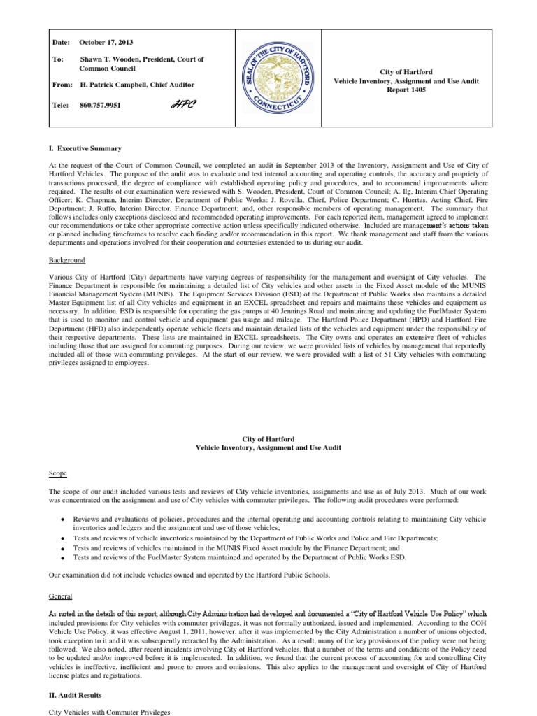 Cityof Hartford Vehicle Inventory, Assignmentand Use Audit