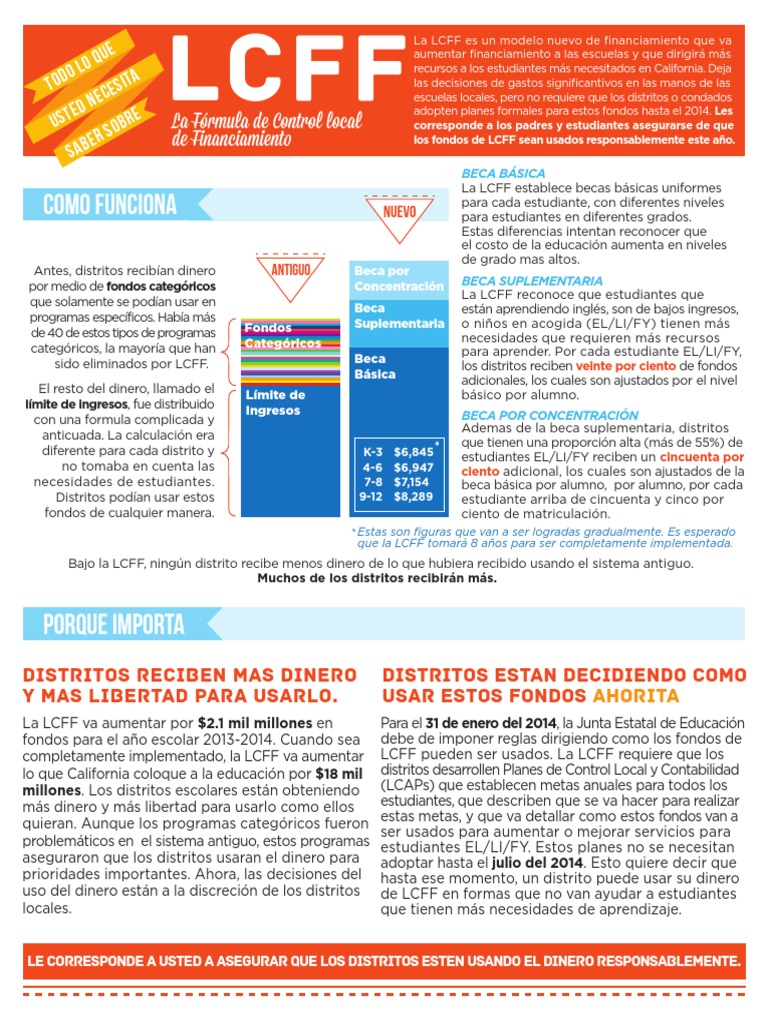 La LCFF es un modelo nuevo de financiamiento que vaaumentar financiamiento a las escuelas y que dirigirá másrecursos a los estudiantes más necesitados en California. Dejalas decisiones de gastos significantivos en las manos de lasescuelas locales, pero no requiere que los distritos o condadosadopten planes formales para estos fondos hasta el 2014.