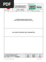 1 2 3 4 5 6 7 8 9 10 11 12 13 14 15 16 17 18 19 20 21 22 23 24 25 26 27 28 29 30 31 32 33 34 35 36 37 38 39 40 41 42 43 44 45 46 47 48 49 50 51 52 53 54 55 56 57 58 59 60 61 62 63 64 65 66 67 68 69 Tag No. Quantity Service Tank Type Tank Size (Diameter x Hight) (m) Area Classification Tank Connection (Antenna) Area Classification Transmitter Safety Classification Pressure (bar.g) Temperature () Viscosity (Cp) Upper Lower Density (kg/m3) Upper Lower Free Water Level m Emulsion Volume (%) Certification Mounting type Process Connection Measuring Range Antenna Type Propagation mode Antenna Size Tank access Antenna surfaces Material Certification Mounting Measuring Type Measurement Principle Internal reference Frequency Ambient temperature Output Signal Power Supply Electrical Connection Lightning protection Enclosure Class Instrument accuracy Accuracy approvals Configuration Tag Number Type Display Cable Connection Wiring Installation Enclosure Class Tag Number Type Quantity Over all length Certification Element spacing Connection Size & Rating Electrical Connection Wire length Measuring Range Accuracy Bulb Material Bulb Diameter Mounting Output Water bottom sensor, Integrated Water bottom sensor length Anchor weight Model Mounting Output Wiring Manufacturer Model No. 1 STORAGE TANK FLOATING ROOF ROOF TANK 67.06 x 19 APPROVED FOR INSTALLATION IN ZONE 0 APPROVED FOR INSTALLATION IN ZONE 1 SIL 2 SUITABLE AND TV APPROVED MAX. NOR.