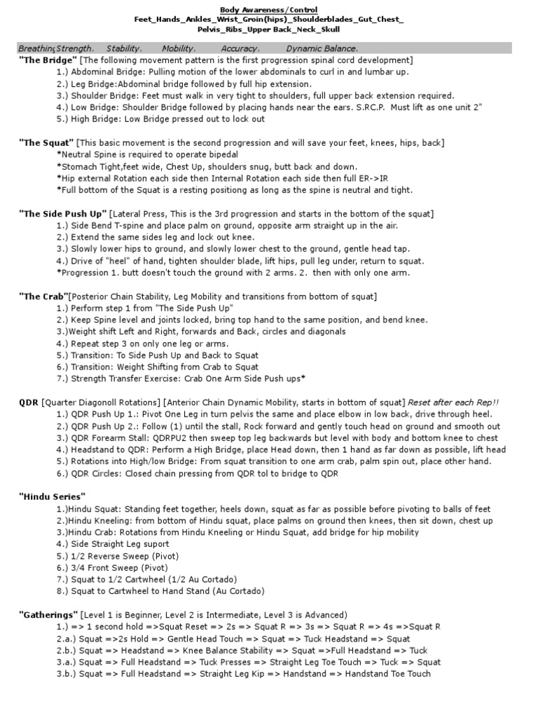 Breathing. Strength. Stability. Mobility. Accuracy. Dynamic Balance. "The Bridge" [The following movement pattern is the first progression spinal cord development] 1.) Abdominal Bridge: Pulling motion of the lower abdominals to curl in and lumbar up. 2.) Leg Bridge:Abdominal bridge followed by full hip extension. 3.) Shoulder Bridge: Feet must walk in very tight to shoulders, full upper back extension required. 4.) Low Bridge: Shoulder Bridge followed by placing hands near the ears. S.RC.P. Must lift as one unit 2" 5.) High Bridge: Low Bridge pressed out to lock out "The Squat" [This basic movement is the second progression and will save your feet, knees, hips, back] *Neutral Spine is required to operate bipedal *Stomach Tight,feet wide, Chest Up, shoulders snug, butt back and down. *Hip external Rotation each side then Internal Rotation each side then full ER->IR *Full bottom of the Squat is a resting positiong as long as the spine is neutral and tight. "The Side Push Up" [Lateral Press, This is the 3rd progression and starts in the bottom of the squat] 1.) Side Bend T-spine and place palm on ground, opposite arm straight up in the air. 2.) Extend the same sides leg and lock out knee. 3.) Slowly lower hips to ground, and slowly lower chest to the ground, gentle head tap. 4.) Drive of "heel" of hand, tighten shoulder blade, lift hips, pull leg under, return to squat. *Progression 1. butt doesn't touch the ground with 2 arms. 2. then with only one arm. "The Crab"[Posterior Chain Stability, Leg Mobility and transitions from bottom of squat] 1.) Perform step 1 from "The Side Push Up" 2.) Keep Spine level and joints locked, bring top hand to the same position, and bend knee. 3.)Weight shift Left and Right, forwards and Back, circles and diagonals 4.) Repeat step 3 on only one leg or arms. 5.) Transition: To Side Push Up and Back to Squat 6.) Transition: Weight Shifting from Crab to Squat 7.) Strength Transfer Exercise: Crab One Arm Side Push ups* QDR [Quarter Diagonoll Rotations] [Anterior Chain Dynamic Mobility, starts in bottom of squat] Reset after each Rep!! 1.) QDR Push Up 1.: Pivot One Leg in turn pelvis the same and place elbow in low back, drive through heel. 2.) QDR Push Up 2.: Follow (1) until the stall, Rock forward and gently touch head on ground and smooth out 3.) QDR Forearm Stall: QDRPU2 then sweep top leg backwards but level with body and bottom knee to chest 4.) Headstand to QDR: Perform a High Bridge, place Head down, then 1 hand as far down as possible, lift head 5.) Rotations into High/low Bridge: From squat transition to one arm crab, palm spin out, place other hand. 6.) QDR Circles: Closed chain pressing from QDR tol to bridge to QDR "Hindu Series" 1.)Hindu Squat: Standing feet together, heels down, squat as far as possible before pivoting to balls of feet 2.)Hindu Kneeling: from bottom of Hindu squat, place palms on ground then knees, then sit down, chest up 3.)Hindu Crab: Rotations from Hindu Kneeling or Hindu Squat, add bridge for hip mobility 4.) Side Straight Leg suport 5.) 1/2 Reverse Sweep (Pivot) 6.) 3/4 Front Sweep (Pivot) 7.) Squat to 1/2 Cartwheel (1/2 Au Cortado) 8.) Squat to Cartwheel to Hand Stand (Au Cortado) "Gatherings" [Level 1 is Beginner, Level 2 is Intermediate, Level 3 is Advanced) 1.) => 1 second hold =>Squat Reset => 2s => Squat R => 3s => Squat R => 4s =>Squat R 2.a.) Squat =>2s Hold => Gentle Head Touch => Squat => Tuck Headstand => Squat 2.b.) Squat => Headstand => Knee Balance Stability => Squat =>Full Headstand => Tuck 3.a.) Squat => Full Headstand => Tuck Presses => Straight Leg Toe Touch => Tuck => Squat 3.b.) Squat => Full Headstand => Straight Leg Kip => Handstand => Handstand Toe Touch