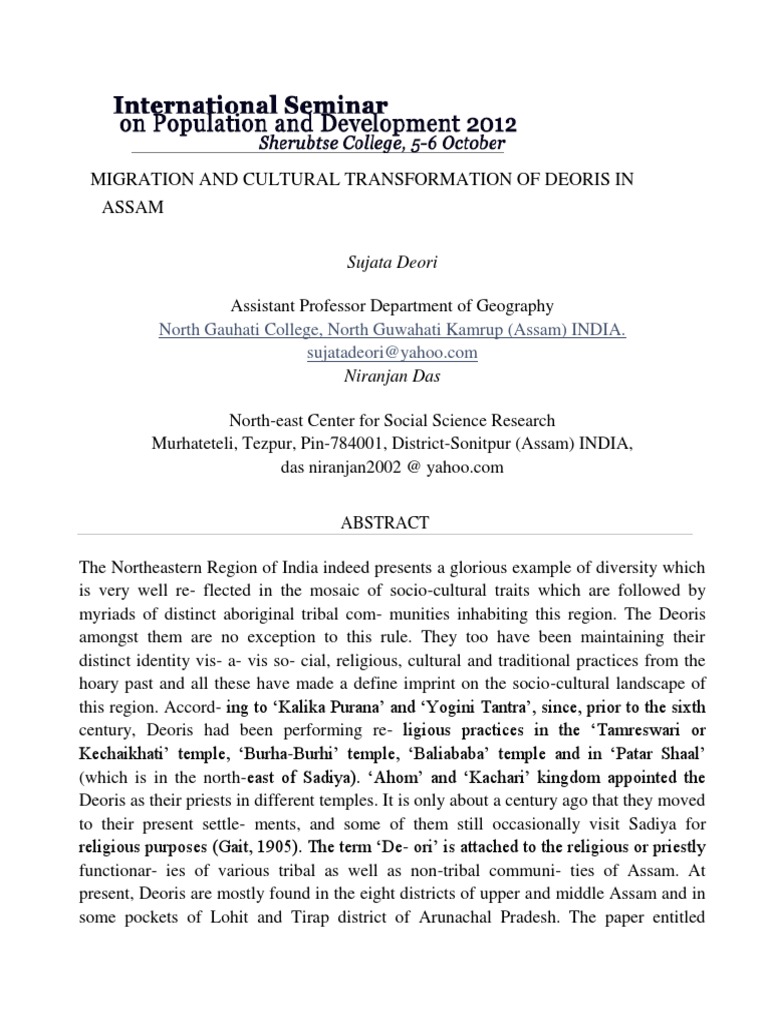 Migration and Socio- Cultural Transformation of Deoris in Assam analyses the migration and socio-cultural changes of Deoris that were firmly practiced in the preindependent period. 1. INTRODUCTION There is a close relationship between the population migration and the resultant distribution of that particular group of people and both these factors are respon- sible for consequent social and economic development of that group of people (Taher, 1993). The determinants and pattern of population migration, their re- distribution, and consequent socio-economic and cul- tural changes are becoming insensibly important for researcher and policy makers and planners (Ahmad, et al 1987). Migration is a geographical phenomenon that seems to be a human necessity in every age. The south Asian subcontinent long experienced virtually uninterrupted demographic mobility, which was reflected in the almost unchecked transfer and resettlement of pop- ulation in a number of places. Such population mobil- ity was due to both environmental and socio-economic causes (Chandna, 1990). The causes of migration may be numerous and these may range from natural calami- ties, climatic change, epidemics, and drought to socio- economic, cultural and political. The population compositions of India including different ethnic groups having different socio-cultural identities a fairly sizable tribal population contributes to the Indian culture with their own traditional socio- cultural traits. Of course the tribal segment is far from homogeneity and displays a fairly high degree of diversity in its socio-cultural traits and the stage of so- cial evaluation and their spatial distribution (Waddel, 1975). A common feature of all tribal groups is that historically they have remained away from the main centre of population agglomeration. They have a ten- dency to live in isolation i.e. the forested areas, hills, and sometimes river banks are the common place for their settlements (Barkataki, 1969). In the historic past various tribes migrated to India from different parts of the world and settled in such places where they can be secured (Barpujari, 1988). But in course of time many tribal groups had to mi- grate from their original settlement to different loca- tions within the region due to various causes like