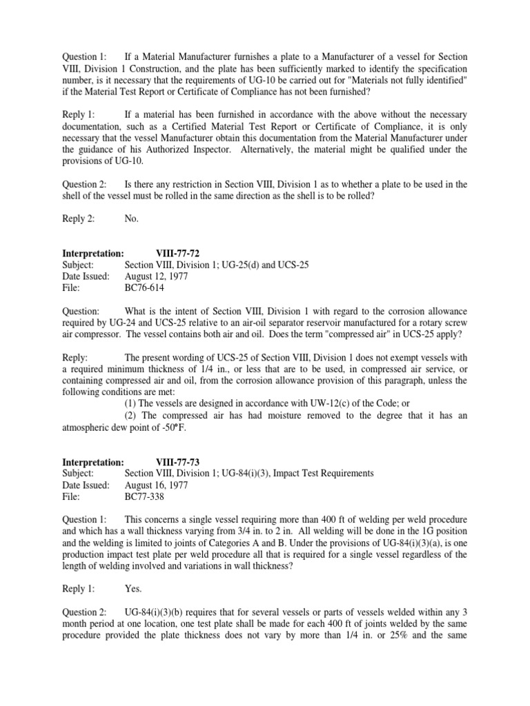Interpretation: VIII-77-73 Subject: Section VIII, Division 1; UG-84(i)(3), Impact Test Requirements Date Issued: August 16, 1977 File: BC77-338 Question 1: This concerns a single vessel requiring more than 400 ft of welding per weld procedure and which has a wall thickness varying from 3/4 in. to 2 in. All welding will be done in the 1G position and the welding is limited to joints of Categories A and B. Under the provisions of UG-84(i)(3)(a), is one production impact test plate per weld procedure all that is required for a single vessel regardless of the length of welding involved and variations in wall thickness? Reply 1: Yes.
