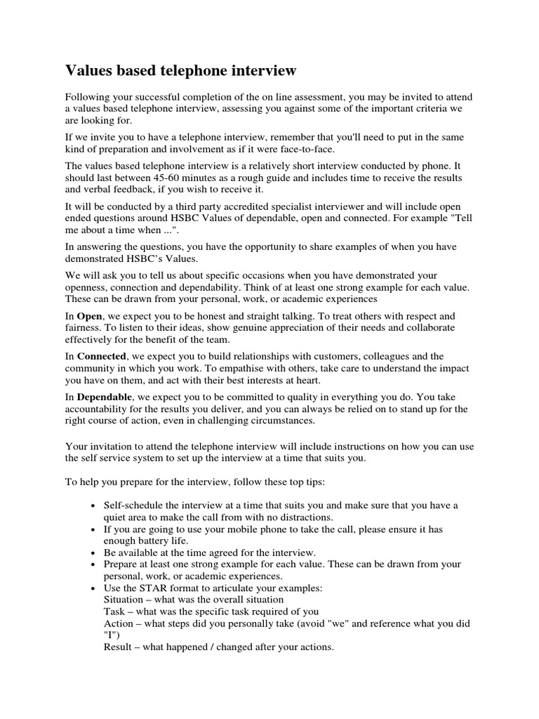 Following your successful completion of the on line assessment, you may be invited to attend a values based telephone interview, assessing you against some of the important criteria we are looking for. If we invite you to have a telephone interview, remember that you'll need to put in the same kind of preparation and involvement as if it were face-to-face. The values based telephone interview is a relatively short interview conducted by phone. It should last between 45-60 minutes as a rough guide and includes time to receive the results and verbal feedback, if you wish to receive it. It will be conducted by a third party accredited specialist interviewer and will include open ended questions around HSBC Values of dependable, open and connected. For example "Tell me about a time when ...". In answering the questions, you have the opportunity to share examples of when you have demonstrated HSBCs Values. We will ask you to tell us about specific occasions when you have demonstrated your openness, connection and dependability. Think of at least one strong example for each value. These can be drawn from your personal, work, or academic experiences In Open, we expect you to be honest and straight talking. To treat others with respect and fairness. To listen to their ideas, show genuine appreciation of their needs and collaborate effectively for the benefit of the team. In Connected, we expect you to build relationships with customers, colleagues and the community in which you work. To empathise with others, take care to understand the impact you have on them, and act with their best interests at heart. In Dependable, we expect you to be committed to quality in everything you do. You take accountability for the results you deliver, and you can always be relied on to stand up for the right course of action, even in challenging circumstances. Your invitation to attend the telephone interview will include instructions on how you can use the self service system to set up the interview at a time that suits you. To help you prepare for the interview, follow these top tips: