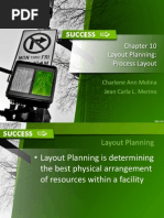 Process Layout:- It is also called functional layout. It is generally associated with batch production. Factory is divided into similar process units. and with in these similar process units all similar facilities are groped together. Example Movie sets or studios. 2. Product layout:- It is also called line layout. The layout plant, size and shape of building, location and shape of storage yard, position of material handling equipment is such that material is flowed in one direction at the steady rate. All equipments and machines used in this process are of special type and highly trained labor is used in this layout. Examples are assembly lines of automobiles, refrigerators, radio, televisions and air conditioners. [Link] layout:- It is also called fixed position layout. in this type of layout procut to be produced remain at fixed position and machine,material and man are brought at the asssimbly position. Examples Aeroplane, ships and heavy machines. 4. Cellular Layouts:- Primarily this type of layout is an attempt to reduce the complexity of process layouts. It divides transforming resource up into small clusters which can be used to act upon different products or product groups. Within each cell layout can be almost identical to product layout