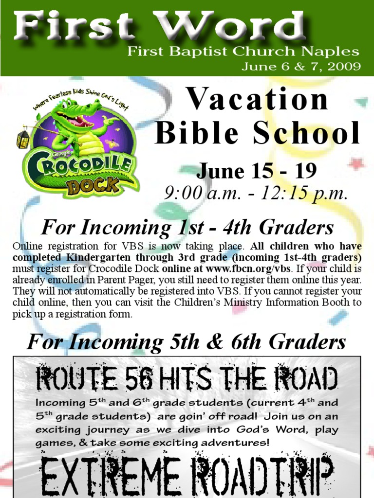 must register for Crocodile Dock online at www.fbcn.org/vbs. If your child is