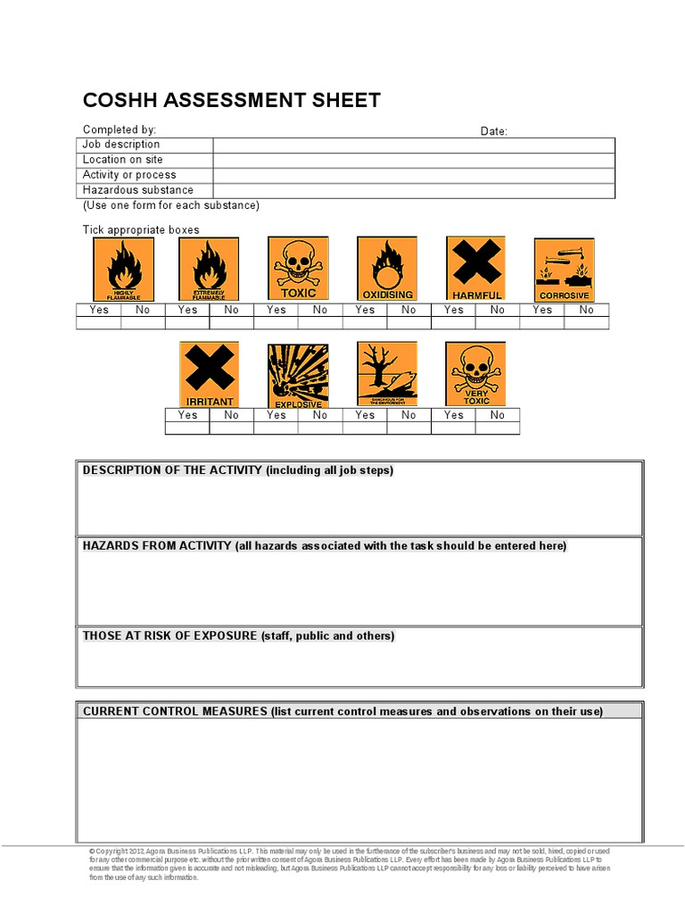 Completed by: Job description Location on site Activity or process Hazardous substance used (Use one form for each substance) Tick appropriate boxes Date: