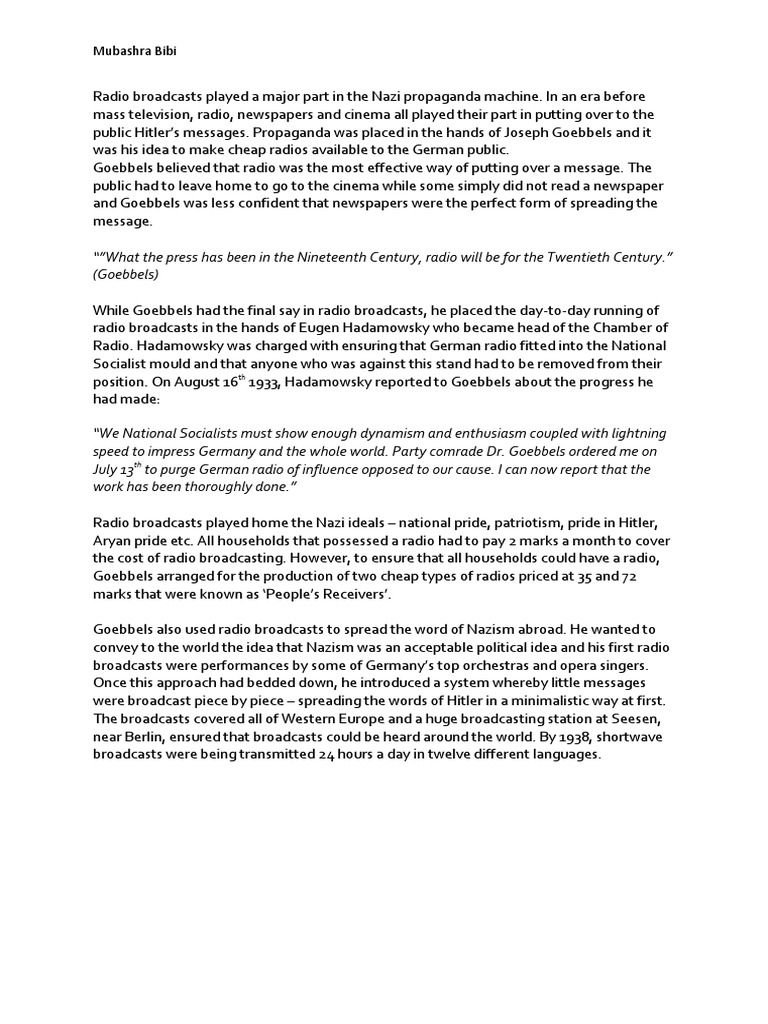 Radio broadcasts played a major part in the Nazi propaganda machine. In an era before mass television, radio, newspapers and cinema all played their part in putting over to the public Hitlers messages. Propaganda was placed in the hands of Joseph Goebbels and it was his idea to make cheap radios available to the German public. Goebbels believed that radio was the most effective way of putting over a message. The public had to leave home to go to the cinema while some simply did not read a newspaper and Goebbels was less confident that newspapers were the perfect form of spreading the message. What the press has been in the Nineteenth Century, radio will be for the Twentieth Century. (Goebbels) While Goebbels had the final say in radio broadcasts, he placed the day-to-day running of radio broadcasts in the hands of Eugen Hadamowsky who became head of the Chamber of Radio. Hadamowsky was charged with ensuring that German radio fitted into the National Socialist mould and that anyone who was against this stand had to be removed from their position. On August 16th 1933, Hadamowsky reported to Goebbels about the progress he had made: We National Socialists must show enough dynamism and enthusiasm coupled with lightning speed to impress Germany and the whole world. Party comrade Dr. Goebbels ordered me on July 13th to purge German radio of influence opposed to our cause. I can now report that the work has been thoroughly done. Radio broadcasts played home the Nazi ideals national pride, patriotism, pride in Hitler, Aryan pride etc. All households that possessed a radio had to pay 2 marks a month to cover the cost of radio broadcasting. However, to ensure that all households could have a radio, Goebbels arranged for the production of two cheap types of radios priced at 35 and 72 marks that were known as Peoples Receivers. Goebbels also used radio broadcasts to spread the word of Nazism abroad. He wanted to convey to the world the idea that Nazism was an acceptable political idea and his first radio broadcasts were performances by some of Germanys top orchestras and opera singers. Once this approach had bedded down, he introduced a system whereby little messages were broadcast piece by piece spreading the words of Hitler in a minimalistic way at first. The broadcasts covered all of Western Europe and a huge broadcasting station at Seesen, near Berlin, ensured that broadcasts could be heard around the world. By 1938, shortwave broadcasts were being transmitted 24 hours a day in twelve different languages.