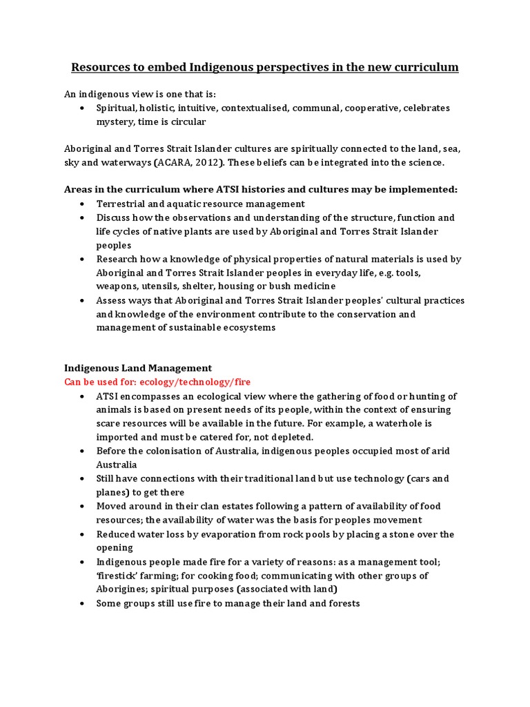 An indigenous view is one that is: Spiritual, holistic, intuitive, contextualised, communal, cooperative, celebrates mystery, time is circular Aboriginal and Torres Strait Islander cultures are spiritually connected to the land, sea, sky and waterways (ACARA, 2012). These beliefs can be integrated into the science. Areas in the curriculum where ATSI histories and cultures may be implemented: Terrestrial and aquatic resource management Discuss how the observations and understanding of the structure, function and life cycles of native plants are used by Aboriginal and Torres Strait Islander peoples Research how a knowledge of physical properties of natural materials is used by Aboriginal and Torres Strait Islander peoples in everyday life, e.g. tools, weapons, utensils, shelter, housing or bush medicine Assess ways that Aboriginal and Torres Strait Islander peoples' cultural practices and knowledge of the environment contribute to the conservation and management of sustainable ecosystems