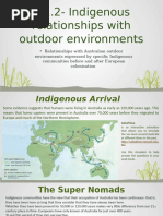 Indigenous Land Management Can be used for: ecology/technology/fire ATSI encompasses an ecological view where the gathering of food or hunting of animals is based on present needs of its people, within the context of ensuring scare resources will be available in the future. For example, a waterhole is imported and must be catered for, not depleted. Before the colonisation of Australia, indigenous peoples occupied most of arid Australia Still have connections with their traditional land but use technology (cars and planes) to get there Moved around in their clan estates following a pattern of availability of food resources; the availability of water was the basis for peoples movement Reduced water loss by evaporation from rock pools by placing a stone over the opening Indigenous people made fire for a variety of reasons: as a management tool; firestick farming; for cooking food; communicating with other groups of Aborigines; spiritual purposes (associated with land) Some groups still use fire to manage their land and forests