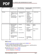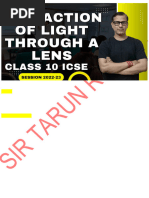 p. 118 The Human Eye The human eye relies on the lens near the front of the eye to focus an image on the retina the screen at the back of the eye on which a real image is formed. See Figure 26.34 on page 830 in your text. The lens is connected to a muscle (the ciliary muscle) through suspensory ligaments. The ciliary muscle, when tensed, changes the shape of the lens, thereby changing its focal length. Note that the lens of the eye is a converging lens. (How can you tell?) When an object is placed in front of the eye, the ciliary muscle will automatically adjust the focal length of the lens of the eye in an attempt to produce a sharp image of the object on the retina. The process in which the lens changes its focal length to focus on objects at different distances is called accommodation. The point nearest the eye at which an object can be placed and still produce a sharp image on the retina is called the near point of the eye. For people in their early twenties who have good vision this distance is about 25 cm. This distance increases with age, to about 50 cm at age 40 and to roughly 500 cm (5 meters!) at age 60. Since most reading material is held about 45 cm from the eye, older people need eyeglasses to overcome the loss of accommodation. The point farthest from the eye at which an object can be focused by a completely relaxed eye is called the far point. For a person with normal eyesight this point is at infinity. Nearsightedness A person with nearsightedness (myopia) has a far point that is not at infinity. The person can focus on objects that are close to the eye but not on objects that are far away. In this case the relaxed lens of the eye forms a sharp image of a distant object in front of the retina. See Figure 26.36a on page 832 in your text. To correct myopia a diverging lens is placed in front of the eye. If the focal length of the diverging lens is adjusted properly, the far point can be moved to infinity. Example A nearsighted person has a far point 449 cm from the eye. Find the focal length needed for eyeglasses that are worn 2.00 cm from the eye. The idea here is that we assume an object distance of infinity; the lens is to form an image of this object at the persons far point, so that it can be focused by the eye. Since the eyeglasses sit 2.00 cm in front of the eye, the image distance for the lenses will be taken to be 447 cm. (Why is a negative image distance used?) Use the thin-lens equation: 1 1 1 = + ; f dO di Farsightedness A person with farsightedness (hyperopia) has a near point that is much larger than 25 cm. The person can focus on objects that are far from the eye but not on objects that close to the eye. In this case the tensed lens of the eye forms a sharp image of a close object in back of the retina. See Figure 26.37a on page 833 in your text. 1 1 1 = + ; f 447 cm f = 447 cm (The negative focal length indicates a diverging lens.)