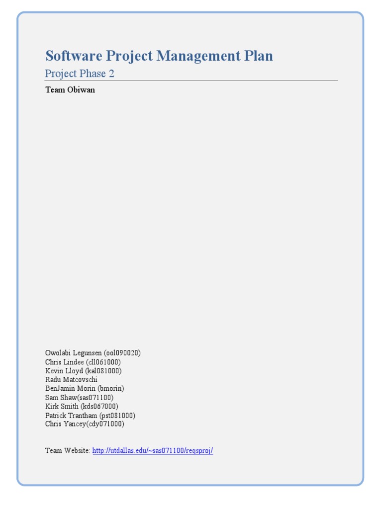 Owolabi Legunsen (ool090020) Chris Lindee (cll061000) Kevin Lloyd (kal081000) Radu Matcovschi BenJamin Morin (bmorin) Sam Shaw(sas071100) Kirk Smith (kds067000) Patrick Trantham (pst081000) Chris Yancey(cdy071000) Team Website: http://utdallas.edu/~sas071100/reqsproj/