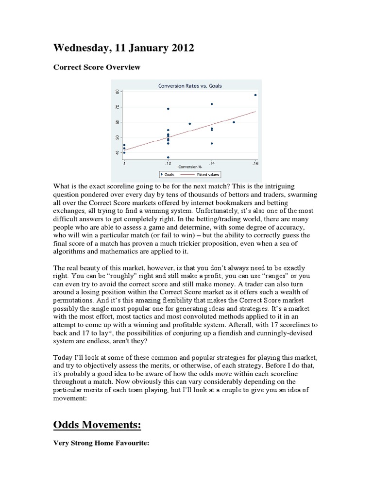What is the exact scoreline going to be for the next match? This is the intriguing question pondered over every day by tens of thousands of bettors and traders, swarming all over the Correct Score markets offered by internet bookmakers and betting exchanges, all trying to find a winning system. Unfortunately, its also one of the most difficult answers to get completely right. In the betting/trading world, there are many people who are able to assess a game and determine, with some degree of accuracy, who will win a particular match (or fail to win) but the ability to correctly guess the final score of a match has proven a much trickier proposition, even when a sea of algorithms and mathematics are applied to it. The real beauty of this market, however, is that you dont always need to be exactly right. You can be roughly right and still make a profit; you can use ranges or you can even try to avoid the correct score and still make money. A trader can also turn around a losing position within the Correct Score market as it offers such a wealth of permutations. And its this amazing flexibility that makes the Correct Score market possibly the single most popular one for generating ideas and strategies. Its a market with the most effort, most tactics and most convoluted methods applied to it in an attempt to come up with a winning and profitable system. Afterall, with 17 scorelines to back and 17 to lay*, the possibilities of conjuring up a fiendish and cunningly-devised system are endless, aren't they? Today Ill look at some of these common and popular strategies for playing this market, and try to objectively assess the merits, or otherwise, of each strategy. Before I do that, it's probably a good idea to be aware of how the odds move within each scoreline throughout a match. Now obviously this can vary considerably depending on the particular merits of each team playing, but Ill look at a couple to give you an idea of movement: