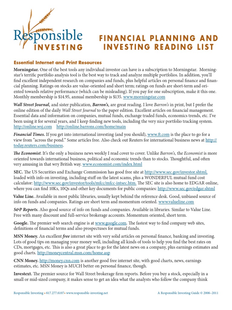 FINANCIAL PLANNING AND INVESTING READING LIST