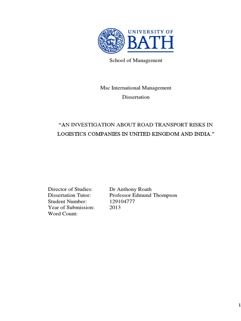 through which, the transfer of the goods is possible. One of the main mode of transportation has been by the Road because of the flexibility it provides in comparision to others. A company is associated with various number of risks while distributing the goods. A company might face the risk due to the Economic, Cultural, Political changes in the market. Therefore, it would be interesting to explore this area a little bit more in detail. The purpose of this dissertation is to investigate the Road transport risk