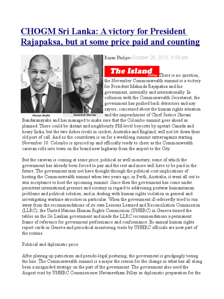 Rajan Philips-October 26, 2013, 6:09 pm There is no question, the November Commonwealth summit is a victory for President Mahinda Rajapaksa and his government, internally and internationally. In collusion with the Commonwealth Secretariat, the government has pushed back detractors and nay sayers, concerned about the human rights situation and the impeachment of Chief Justice Shirani Bandaranayake and has managed to make sure that the Colombo summit goes ahead as planned. There could be distant and neighbourly PM-level boycotts by upstart Canada and hoary India, but the two Ashes rivals in cricket, Australia and England, will not let down their old port of call. And so the countdown is on for a weeklong summit extravaganza starting November 10. Colombo is spruced up and officially ready to cheer as the Commonwealth caravan rolls into town on the brand new highway from the airport to the City. But the caravan is coming at some price, political as well monetary, some of which the government has already been forced to pay and the rest and more will have to be paid in the future. The government may not have thought through the political-cost implications of hosting the Commonwealth summit when two years ago, in Perth, Australia, it went all out to win acceptance to host the upcoming summit. Since then the government has come under persistent international pressure and scrutiny in regard to addressing postwar humanitarian problems and political solution, and in dealing with human rights violation in general and investigating wartime atrocities in particular. When the government ill-advisedly tried to run away from the recommendations of its own Lessons Learned and Reconciliation Commission (LLRC), the United Nations Human Rights Commission (UNHRC) in Geneva turned the tables on the Sri Lankan government and made the LLRC recommendations a permanent frame of reference for government performance and conformance. Bi-annual human rights report cards in Geneva and periodical monitoring visits by UNHRC officials are now part of the routine. Political and diplomatic price After playing up patriotism and pseudo-legal posturing, the government is grudgingly toeing the line. The Commonwealth summit is a major the reason for the change in what has all along been a misguided strategy on the part of the government. The government also used the August visit by UNHRC Commissioner Navaneetham Pillay as diplomatic preparation for the