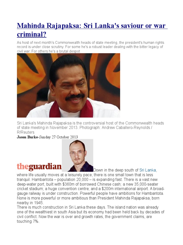 "We can live with it, but the public finger-wagging doesn't help anyone," said one senior Sri Lankan diplomat. Since the end of the war other concerns have intensified. There have been scores, some say hundreds, of abductions. Journalists are systematically threatened. Trade unionists and human rights activists receive regular "warnings" or are roughed up. The constitution has been changed to allow Rajapaksa a third term. Dozens of his relatives hold government posts, controlling, according to one estimate, nearly half the state expenditure. A son is being groomed as a successor. There are widespread allegations of graft and an upsurge in sectarian violence. "It is a situation of total state capture," said JC Weliamuna, a leading human rights lawyer in Colombo. This is south Asia, of course, where zero-sum politics, dynasties, massive development in the native towns of incumbent leaders, marginalised minorities and corruption is unexceptional. Tourist visits and revenues are up though not by as much as the government would like, or, probably, claims. Foreign investment worth $2bn is expected this year, officials say. But even regionally there are now worries about where Sri Lanka is headed. These concerns will all be carefully obscured next month. So far the only invited leader not attending the Commonwealth summit is Canada's Stephen Harper. David Cameron says "tough messages" are best delivered in person. Rajapaksa will no doubt be his usual bluff and cheery self at the meeting. But if anyone is delivering a tough message, it will be him. THE RAJAPAKSA FILE Born Percy Mahinda Rajapaksa in Weeraketiya, Hambantota, 18 November 1945. His father was a cabinet minister, DA Rajapaksa. Elected to Parliament in 1970. Studied at the Sri Lanka law college, graduating in 1977. Married Shiranthi Wickramasinghe. Three children: Namal, Yoshitha and Rohitha. Best of times 1994: Appointed minister of labour; 2002: leader of opposition; 2004: became Sri Lanka's 13th prime minister; 2005: sworn in as sixth president. Worst of times Accused of war crimes in 2009, allegations including responsibility for massacres of LTTE (Tamil Tiger) fighters and Tamil civilians. What he says "The government is not ready to enter into any kind of ceasefire with terrorists... It is my duty to protect the people of this country. I don't need lectures from western representatives." "We should live in this country as children of one mother. No differences of race, caste and religion should prevail here." What others say "I've read his speeches and I knew he was a Sinhalese extremist. I cannot change his mind" - Lee Kuan Yew, Singapore's founding prime minister.