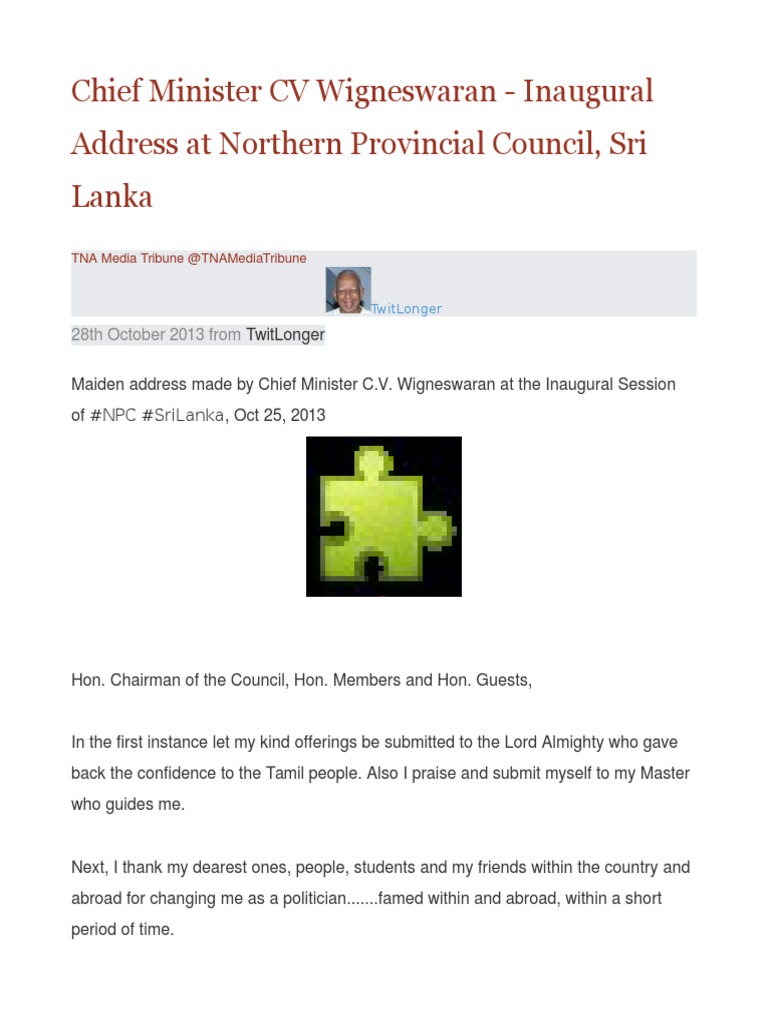 28th October 2013 from TwitLonger Maiden address made by Chief Minister C.V. Wigneswaran at the Inaugural Session of #NPC #SriLanka, Oct 25, 2013