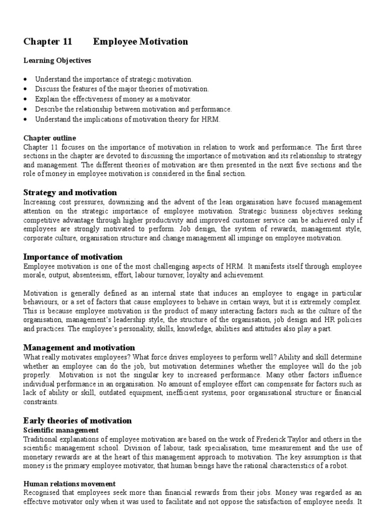 Chapter 11 focuses on the importance of motivation in relation to work and performance. The first three