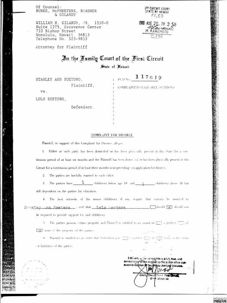Mother, adoptive father of Barack Hussein Obama. Divorce documents filed in Honolulu, August 20, 1980.