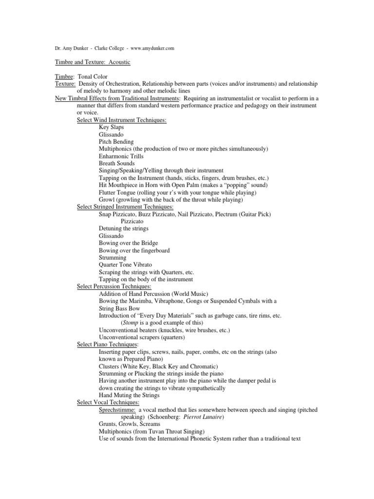 Timbre and Texture: Acoustic Timbre: Tonal Color Texture: Density of Orchestration, Relationship between parts (voices and/or instruments) and relationship of melody to harmony and other melodic lines New Timbral Effects from Traditional Instruments: Requiring an instrumentalist or vocalist to perform in a manner that differs from standard western performance practice and pedagogy on their instrument or voice. Select Wind Instrument Techniques: Key Slaps Glissando Pitch Bending Multiphonics (the production of two or more pitches simultaneously) Enharmonic Trills Breath Sounds Singing/Speaking/Yelling through their instrument Tapping on the Instrument (hands, sticks, fingers, drum brushes, etc.) Hit Mouthpiece in Horn with Open Palm (makes a popping sound) Flutter Tongue (rolling your rs with your tongue while playing) Growl (growling with the back of the throat while playing) Select Stringed Instrument Techniques: Snap Pizzicato, Buzz Pizzicato, Nail Pizzicato, Plectrum (Guitar Pick) Pizzicato Detuning the strings Glissando Bowing over the Bridge Bowing over the fingerboard Strumming Quarter Tone Vibrato Scraping the strings with Quarters, etc. Tapping on the body of the instrument Select Percussion Techniques: Addition of Hand Percussion (World Music) Bowing the Marimba, Vibraphone, Gongs or Suspended Cymbals with a String Bass Bow Introduction of Every Day Materials such as garbage cans, tire rims, etc. (Stomp is a good example of this) Unconventional beaters (knuckles, wire brushes, etc.) Unconventional scrapers (quarters) Select Piano Techniques: Inserting paper clips, screws, nails, paper, combs, etc on the strings (also known as Prepared Piano) Clusters (White Key, Black Key and Chromatic) Strumming or Plucking the strings inside the piano Having another instrument play into the piano while the damper pedal is down creating the strings to vibrate sympathetically Hand Muting the Strings Select Vocal Techniques: Sprechstimme: a vocal method that lies somewhere between speech and singing (pitched speaking) (Schoenberg: Pierrot Lunaire) Grunts, Growls, Screams Multiphonics (from Tuvan Throat Singing) Use of sounds from the International Phonetic System rather than a traditional text