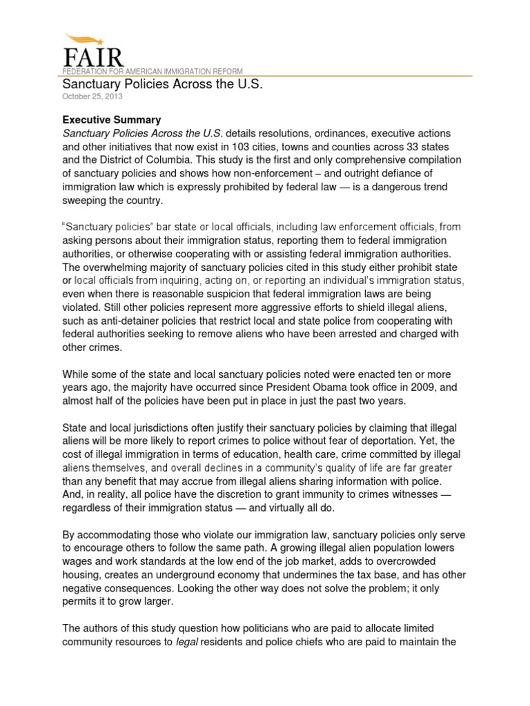 . details resolutions, ordinances, executive actions and other initiatives that now exist in 103 cities, towns and counties across 33 states and the District of Columbia. This study is the first and only comprehensive compilation of sanctuary policies and shows how non-enforcement