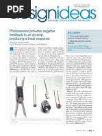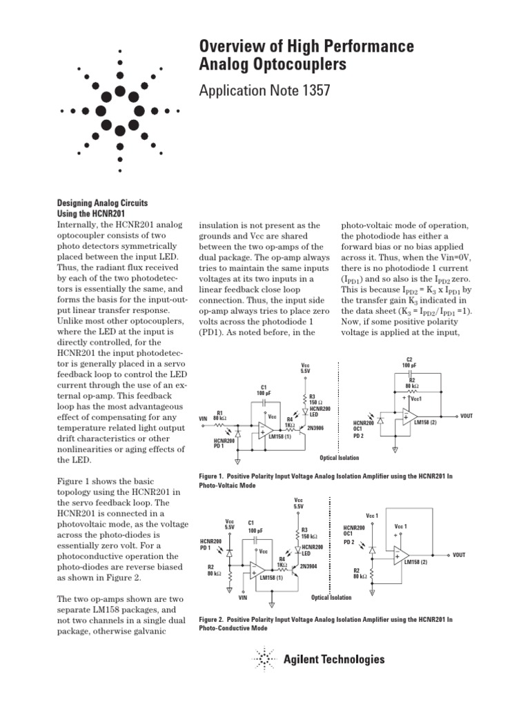 Designing Analog Circuits Using the HCNR201 Internally, the HCNR201 analog optocoupler consists of two photo detectors symmetrically placed between the input LED. Thus, the radiant flux received by each of the two photodetectors is essentially the same, and forms the basis for the input-output linear transfer response. Unlike most other optocouplers, where the LED at the input is directly controlled, for the HCNR201 the input photodetector is generally placed in a servo feedback loop to control the LED current through the use of an external op-amp. This feedback loop has the most advantageous effect of compensating for any temperature related light output drift characteristics or other nonlinearities or aging effects of the LED. Figure 1 shows the basic topology using the HCNR201 in the servo feedback loop. The HCNR201 is connected in a photovoltaic mode, as the voltage across the photo-diodes is essentially zero volt. For a photoconductive operation the photo-diodes are reverse biased as shown in Figure 2. The two op-amps shown are two separate LM158 packages, and not two channels in a single dual package, otherwise galvanic