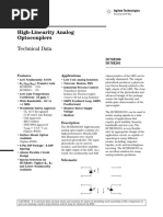 during both positive and negative portions of the input signal. Balance control R1 at the input can be used to adjust the relative gain for the positive and negative input voltages. The gain control R7 can be used to adjust the overall transfer gain of the amplifier. The capacitors C1, C2, and C3 are the compensation capacitors for stability. Current to Voltage Converter For measurement of very small currents such as transducer sensor currents, a simple analog current-to-voltage circuit can be designed as shown in Figure 4. This circuit uses two HCNR200 optocouplers. The input current can be of either polarity. The upper limit for the IIN should be constrained to 50 A maximum to achieve the non-linearity specifications of 0.05% indicated in the data sheet. The lower limit of the current measurement depends upon the maximum dark current associated with the photodiodes, which are approximately in the neighborhood of 100 pA maximum over temperature. The two HCNR200 devices in this configuration are essentially connected in anti-parallel configuration. One HCNR200 then translates the positive input current to a positive voltage. The second HCNR200 translates the negative current into a negative output voltage. The resistor R2 is chosen to give the full scale output voltage as: Vout = IIN R2 = full scale output voltage. Thus R2 would be 100 kohm at 50 A max input current for a full-scale output voltage of 5V. Photo diode currents up to 100 A or higher can also be easily selected.