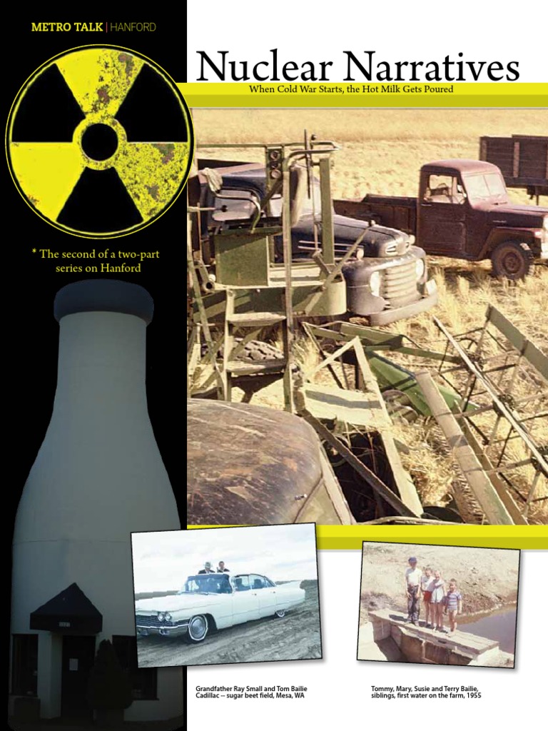 Ow mAnY tImEs have we been told to eat your veggies, fruit and cheese, and drink three glasses of milk a day, with the promise of growing up to be strong, healthy, the picture of a gallant, robust American? Good advice pre-Ozzie and Harriet days. For Spokane and other cities, the milk pathway, as scientists call it, is where the cows in the TriCities grazed on contaminated hay and grass, laced with iodine-131. That milk was shipped twice weekly to our fair city starting in the 1940s through 1960s. Thyroids and guts went haywire, and cancers developed. Or at least thats what one side of the Downwinder story unveiled. As innocuous as it may sound, the 1949 Green Run at Hanford will live in infamy, tying people living throughout Washington, Idaho and Oregon at the time of the radioactive releases to their shared destiny. Keep in mind that there are human consequences to the story of nuclear energy, hitched to the atom bomb, and now forever galvanized to the entire question about nuclear energys efficacy. For now, there are three downwinders and one author rendezvousing to propel the sometimes-misbegotten legacy of those sickened by Hanford and corralled by the secrecy. Their narrative is enmeshed in the story of milk trains coming to Spokane and the winds of radioactive sickness and slow death tracing the hills, coulees, valleys and Ice Ageflooded scablands of this unique place of first nations tribes who are now relegated to their own reservations. When Radioactive History is Rewritten, Peoples Stories Surface Many tribes have pulled out three-eyed salmon from the Columbia. Even articles in the Spokesman-Review titled The Night the Little Demons were Born dating to 1985 bespeak the X-Files lore of Hanford and its plutonium by-products, technically called radionuclides. For the Richland and Tri-Cities stakeholders perpetuating the history and the uneven narrative of Hanford and the massive cleanup effort and contamination zone that made the Tri-Cities one of the fastest growth areas of the country, this is a time of looking at the positives of supposedly winning the Cold War and facing down nuclear annihilation.