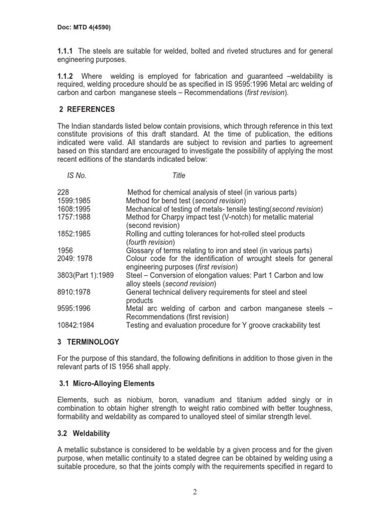 1.1.1 The steels are suitable for welded, bolted and riveted structures and for general engineering purposes. 1.1.2 Where welding is employed for fabrication and guaranteed weldability is required, welding procedure should be as specified in IS 9595:1996 Metal arc welding of carbon and carbon manganese steels Recommendations (first revision). 2 REFERENCES The Indian standards listed below contain provisions, which through reference in this text constitute provisions of this draft standard. At the time of publication, the editions indicated were valid. All standards are subject to revision and parties to agreement based on this standard are encouraged to investigate the possibility of applying the most recent editions of the standards indicated below: IS No. 228 1599:1985 1608:1995 1757:1988 1852:1985 1956 2049: 1978 3803(Part 1):1989 8910:1978 9595:1996 10842:1984 3 TERMINOLOGY For the purpose of this standard, the following definitions in addition to those given in the relevant parts of IS 1956 shall apply. 3.1 Micro-Alloying Elements Elements, such as niobium, boron, vanadium and titanium added singly or in combination to obtain higher strength to weight ratio combined with better toughness, formability and weldability as compared to unalloyed steel of similar strength level. 3.2 Weldability A metallic substance is considered to be weldable by a given process and for the given purpose, when metallic continuity to a stated degree can be obtained by welding using a suitable procedure, so that the joints comply with the requirements specified in regard to Title Method for chemical analysis of steel (in various parts) Method for bend test (second revision) Mechanical of testing of metals- tensile testing(second revision) Method for Charpy impact test (V-notch) for metallic material (second revision) Rolling and cutting tolerances for hot-rolled steel products (fourth revision) Glossary of terms relating to iron and steel (in various parts) Colour code for the identification of wrought steels for general engineering purposes (first revision) Steel Conversion of elongation values: Part 1 Carbon and low alloy steels (second revision) General technical delivery requirements for steel and steel products Metal arc welding of carbon and carbon manganese steels Recommendations (first revision) Testing and evaluation procedure for Y groove crackability test