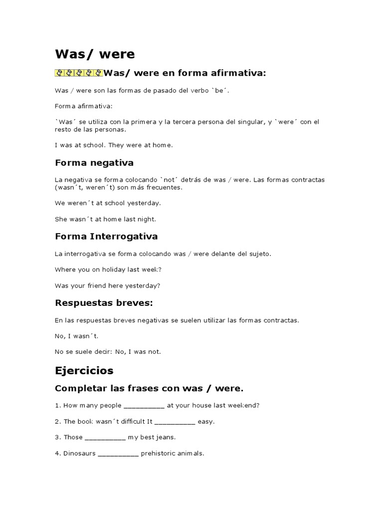 Was / were son las formas de pasado del verbo `be. Forma afirmativa: `Was se utiliza con la primera y la tercera persona del singular, y `were con el resto de las personas. I was at sc ool. ! ey were at ome.