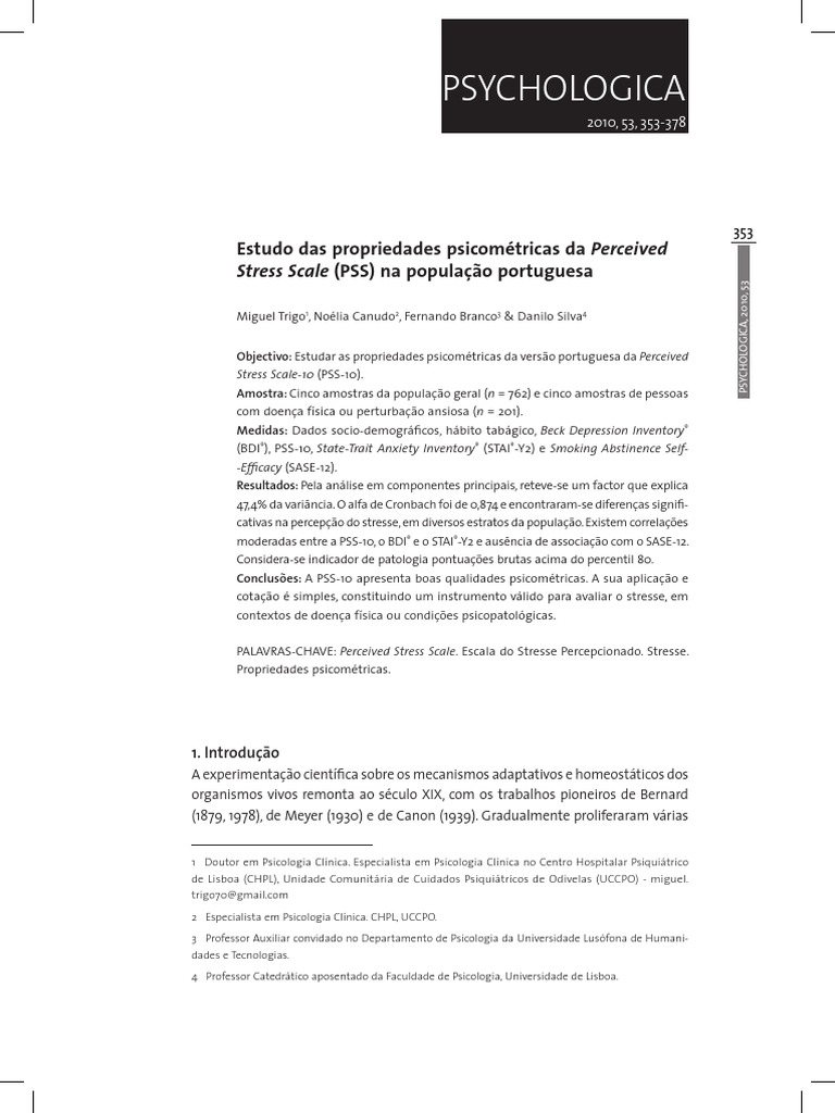Miguel Trigo1, Nolia Canudo2, Fernando Branco3 & Danilo Silva4 Objectivo: Estudar as propriedades psicomtricas da verso portuguesa da Perceived Stress Scale-10 (PSS-10). Amostra: Cinco amostras da populao geral (n = 762) e cinco amostras de pessoas com doena fsica ou perturbao ansiosa (n = 201). Medidas: Dados socio-demogrcos, hbito tabgico, Beck Depression Inventory (BDI), PSS-10, State-Trait Anxiety Inventory (STAI-Y2) e Smoking Abstinence Self-Efcacy (SASE-12). Resultados: Pela anlise em componentes principais, reteve-se um factor que explica 47,4% da varincia. O alfa de Cronbach foi de 0,874 e encontraram-se diferenas signicativas na percepo do stresse, em diversos estratos da populao. Existem correlaes moderadas entre a PSS-10, o BDI e o STAI-Y2 e ausncia de associao com o SASE-12. Considera-se indicador de patologia pontuaes brutas acima do percentil 80. Concluses: A PSS-10 apresenta boas qualidades psicomtricas. A sua aplicao e cotao simples, constituindo um instrumento vlido para avaliar o stresse, em contextos de doena fsica ou condies psicopatolgicas. PALAVRAS-CHAVE: Perceived Stress Scale. Escala do Stresse Percepcionado. Stresse. Propriedades psicomtricas.