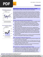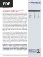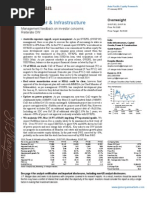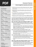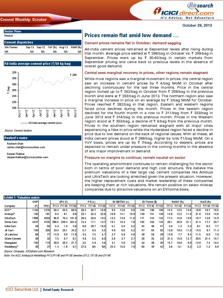 All-India cement prices remained at September levels after rising during that month. Average price settled at | 298/bag in October vs. | 299/bag in September. Prices went up by | 30-40/bag in certain markets from September pricing and came back to previous levels in the absence of overall good demand. Central sees marginal recovery in prices, other regions remain stagnant While most regions saw a marginal movement in prices, the central region saw an increase in cement prices by | 4/bag MoM in October after declining continuously for the last three months. Price in the central region inched up to | 262/bag in October from | 258/bag in the previous month and were at | 293/bag in June 2013. The northern region also saw a marginal increase in price on an average by | 2/bag MoM for October. Prices reached | 282/bag in that region. Eastern and western regions faced price declines during the month. Prices in the eastern region declined for the fourth month in a row to | 311/bag from | 333/bag in June 2013 and | 314/bag in the previous month. Prices in the Western region stood at | 303/bag, a decline of | 6/bag from the previous month. Prices in the southern region remained stagnant with all major cities experiencing a hike in price while the Hyderabad region faced a decline in price due to low demand on the back of regional issues. With all these, all India cement prices stood at | 298/bag, higher by only |1/bag MoM. On a YoY basis, prices are up by | 7/bag. According to dealers, prices are expected to remain under pressure in the coming months in the absence of any major improvement in demand. Pressure on margins to continue; remain neutral on sector The operating environment continues to remain challenging for the sector both in terms of poor demand and high cost structure. We believe the premium valuations of a few large cap cement companies like Ambuja and UltraTech are looking stretched given the present situation. However, the higher replacement costs and market leadership of these companies are keeping them at rich valuations. We remain positive on select midcap companies due to attractive valuations on an EV/tonne basis.