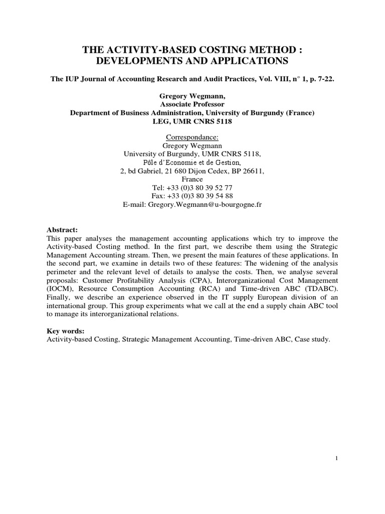 1.2 The ABC developments: A synthesis Many scholars and practitioners admit that ABC has several pitfalls (Anderson and Young, 1999; Datar and Gupta, 1994; Foster and Swenson, 1997; Malmi, 1997). We can make a list of the major criticisms as follow: - A lot of practitioners explain that ABC systems are expensive to implement, time consuming and hard to adjust. For instance, Kaplan and Anderson (p. 5, 2007) describe the ABC system of Hendee Enterprises, a Houston-based manufacturer of awnings. They explain that the ABC software took three days to calculate costs for the companys 150 activities, 10 000 orders and 45 000 line items. - A lot of failures have been compiled, especially in the service industries. - Finally, a lot of people think that the ABC method is too complex. As a consequence, it sometimes fails to clarify the decision making process and the strategy of the firm. This is why since its early stages, several specific applications based on the ABC method have been suggested. Table 1 shows a synthesis of these applications. Their objectives are: -To diversify the costs objects (products, services, processes, customers, markets, ), -To widen the analysis perimeter (spatial and temporal widening), -And to determine the relevant level of details to analyse the costs. These purposes display a common objective: to direct the costs calculations towards the key value factors of the firm.
