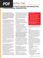 dimensions (Shank and Govindarajan, 1989). For instance, Simmonds (1981) & Bromwich (1990) suggest using qualitative and external measures with three dimensions of analysis: the products & customers dimension, the competitive and the environmental one. The main reasons for implementing a SMA tool, according to the academic literature, lie in the evolution of the environment. This is described in successive stages: stable and predictable, unstable and difficult to anticipate and finally turbulent and unpredictable. As a consequence, scholars explain that management accounting tools like ABC must take into account strategic aspects and integrate them into the companys drive. In order to be an efficient decision tool, a SMA system must closely follow each step of the implementation of the strategy and the achievement of pre-defined objectives. Tomkins and Carr (p. 165, 1996) explain that there is still no agreed comprehensive conceptual framework for what SMA is, and it is still the case. Despite these limitations, the SMA is a good way to analyse the ABC developments. We specify that SMA is based on a process approach of management accounting. In this context, the company is described as a network of horizontal, flat and transverse structures where the activities are organized according to market imperatives. The development at the bottom of the process constitutes a fundamental driver to integration. In this context, the ABC method represents a competencies-based tool. There is a significant relationship between the processes and the competencies of an organization. The vast majority of new management accounting tools has gained strategic and marketing dimensions so that they are in accordance with the SMA frame. So, the SMA Theory leads us to focus on knowledge-based aspects of management accounting. Historically, Contractual Theories constitute the reference. They suggest a disciplinary approach to manage a firm (Agency and Transaction Costs Theories). Brickley et al. (1997) and Zimmerman (1997) for instance use the Contractual Theories when developing a management accounting theory. From a contractual point of view (Jensen and Meckling, 1992), the objectives of the management accounting are: - To reduce conflicts and provide control, - To tie the strategy to resources allocation, - And to facilitate the firms internal coherence. But some authors have proposed significant research using heterodox approaches that we call the Knowledgebased Theories: Organizational Learning Theory (Argyris and Schn, 1978), Resource-based View (Penrose, 1959) and Core-Competencies (Hamel and Prahalad, 1990) approaches. In this context, the value creation is the result of an increase of knowledge and competencies. The SMA approach fits in with both the Contractual and the Knowledge Theories. It aims to tie the strategy to resources allocation and also to facilitate the creation of knowledge. The ABC method was conceived in the mid-80s (Cooper and Kaplan, 1988) mainly to correct misleading overhead allocations. At first, It was a response to the inaccurate standard costing American methods. But several scholars, like Lebas (1991) in France, explain that rapidly, the ABC method has gained managerial (ABM) and strategic dimensions. For example, Shank & Govindarajan (1989) have developed an operational model with the definition of Key Success Factors, determined in using a competitive analysis of the environment and an analysis of the internal processes of the company, with the help of the ABC method. It is integrated in a SMA system with Life-Cycle and Value Chain analyses processes. So the ABC applications clearly belong to the SMA stream.
