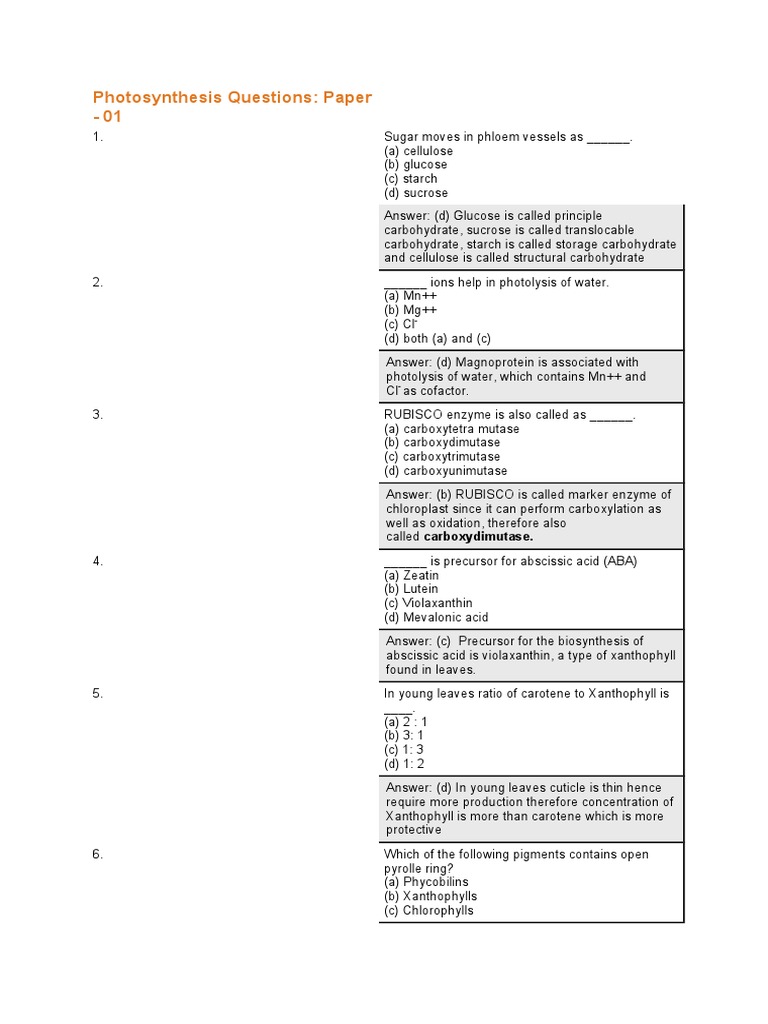 1. Sugar moves in phloem vessels as ______. (a) cellulose (b) glucose (c) starch (d) sucrose Answer: (d) Glucose is called principle carbohydrate, sucrose is called translocable carbohydrate, starch is called storage carbohydrate and cellulose is called structural carbohydrate . ______ ions help in photolysis o! water. (a) "n## (b) "g## (c) $l% (d) both (a) and (c) Answer: (d) "agnoprotein is associated with photolysis o! water, which contains "n## and $l% as co!actor. &. '()*S$+ en,yme is also called as ______. (a) carbo-ytetra mutase (b) carbo-ydimutase (c) carbo-ytrimutase (d) carbo-yunimutase Answer: (b) '()*S$+ is called mar.er en,yme o! chloroplast since it can per!orm carbo-ylation as well as o-idation, there!ore also called carboxydimutase. /. ______ is precursor !or abscissic acid (A)A) (a) 0eatin (b) 1utein (c) 2iola-anthin (d) "evalonic acid Answer: (c) 3recursor !or the biosynthesis o! abscissic acid is viola-anthin, a type o! -anthophyll !ound in leaves. 4. *n young leaves ratio o! carotene to 5anthophyll is ____. (a) : 1 (b) &: 1 (c) 1: & (d) 1: Answer: (d) *n young leaves cuticle is thin hence re6uire more production there!ore concentration o! 5anthophyll is more than carotene which is more protective 7. 8hich o! the !ollowing pigments contains open pyrolle ring9 (a) 3hycobilins (b) 5anthophylls (c) $hlorophylls
