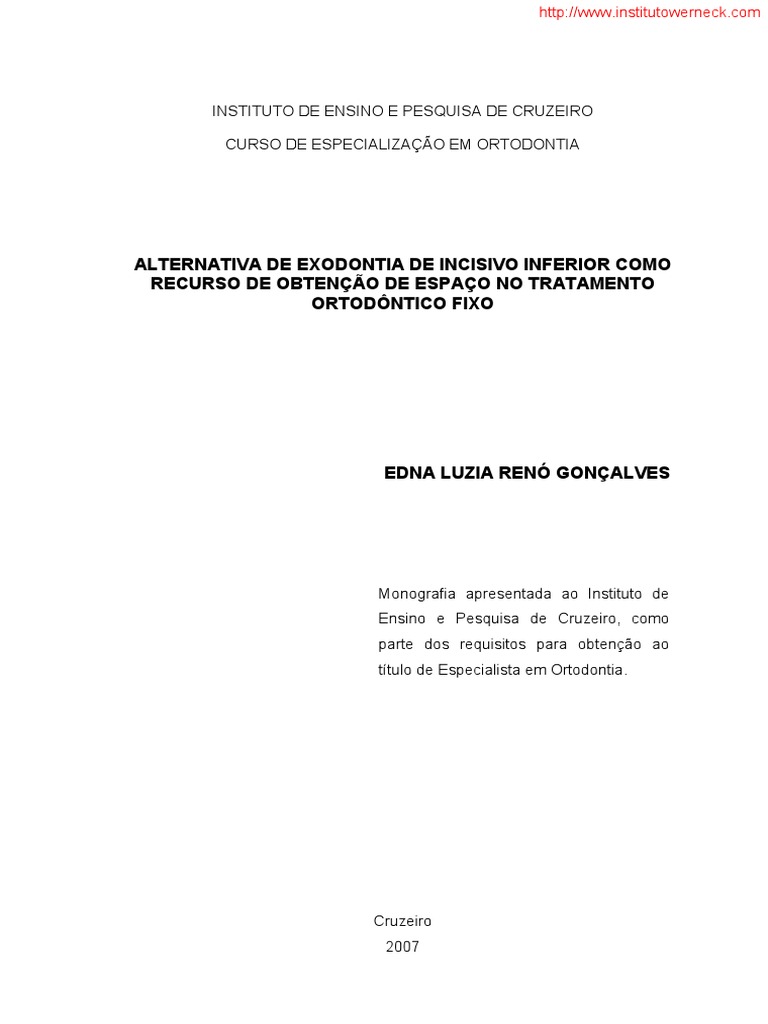 Edna Luzia Reno Gonalves Alternativa de exodontia de incisivos inferiores como recurso de obteno de espao no tratamento ortodntico fixo / Edna Luzia Reno Gonalves, Cruzeiro, 2007. p.; il.; anexos. Bibliografia Monografia (Especializao em Ortodontia) I.E.P.C. Instituto de Ensino e Pesquisa de Cruzeiro. 1. Exodontia. 2. Apinhamento. 3. Tratamento ortodntico fixo.