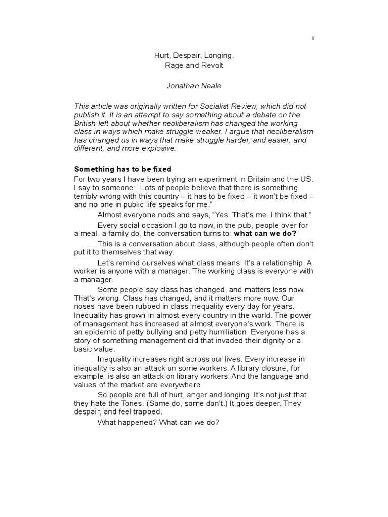 Jonathan Neale contributes to the debate about whether neoliberalism has changed the working class in ways which make struggle weaker. He argues that neoliberalism has changed us "in ways that make struggle harder, and easier, and different, and more explosive".