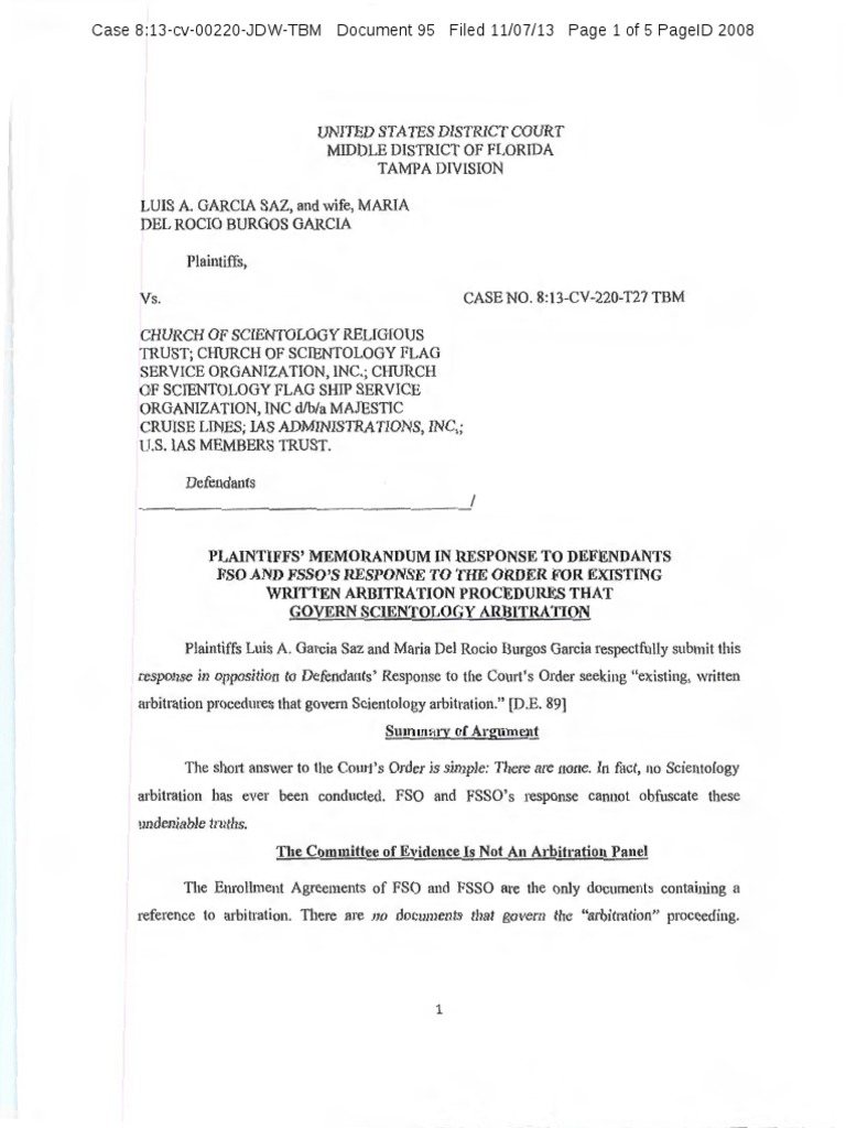 GARCIA SAZ, and wife, MARIA DEL ROCIO BURGOS GARCIA Plaintiffs, Vs. CHURCH OF SCIENTOLOGY RELIGIOUS TRUST; CHURCH OF SCIENTOLOGY FLAG SERVICE ORGANIZATION, INC.; CHURCH OF SCIENTOLOGY FLAG SHIP SERVICE ORGANIZATION, INC d/b/a MAJESTIC CRUISE LINES; lAS ADMINISTRATIONS, INC,; U.S. IAS MEMBERS TRUST. Defendants CASE NO. 8:13-CV-220-T27 TBM