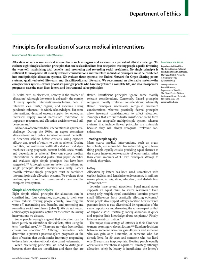 Allocation of very scarce medical interventions such as organs and vaccines is a persistent ethical challenge. We Lancet 2009; 373: 423–31