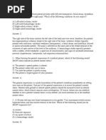 Answer Key 1. B- The rst step in treating a patient with potential cardiac arrest is to administer oxygen. At that point, you should obtain a patient history and perform a physical exam to obtain baseline vital signs. 2. D- When a patient loses consciousness, the rst step is to open the airway. If you nd the patient to be in cardiac arrest based on your initial assessment, you should attach an automated external debrillator. 3. B- In addition to administering oxygen, the most effective way to decrease oxygen demand is to calm and reassure the patient. Driving at high speed, ashing lights, or turning on the siren will only heighten the patients distress. 4. C- In a young child with possible airway obstruction, attempts to remove a mild obstruction may result in severe obstruction. Back blows and chest thrusts should only be performed in the case of a severe obstruction, and nger sweeps only when the child is unconscious and the object is visible in the mouth. The most appropriate course of action is to avoid agitating the child and provide immediate transport to the hospital. 5. A- Young children typically fear a stranger in their environment and will maintain eye contact with that person. Thus, inattentiveness to your presence is indicative of an altered mental state. 6. D- High fever, generalized rash, and altered mental state are indicative of meningitis, or inammation of the tissue protecting the brain and spinal cord. Because a child with meningitis is at high risk for seizures, his or her condition should be carefully monitored during transport to the hospital. 7.C- Rapid trauma assessment is indicated in patients with signicant mechanisms of injury, such as penetrating wounds to the head, neck, chest, or abdomen, falls from a height of >15 feet (such as from a tall building), or multiple long bone fractures. 8. D- In patients with acute ischemic stroke, administering oxygen is the most important rst step, followed by rapid transport to the hospital for brinolytic therapy. Fibrinolytic therapy must be performed within 3 hours of symptom onset.