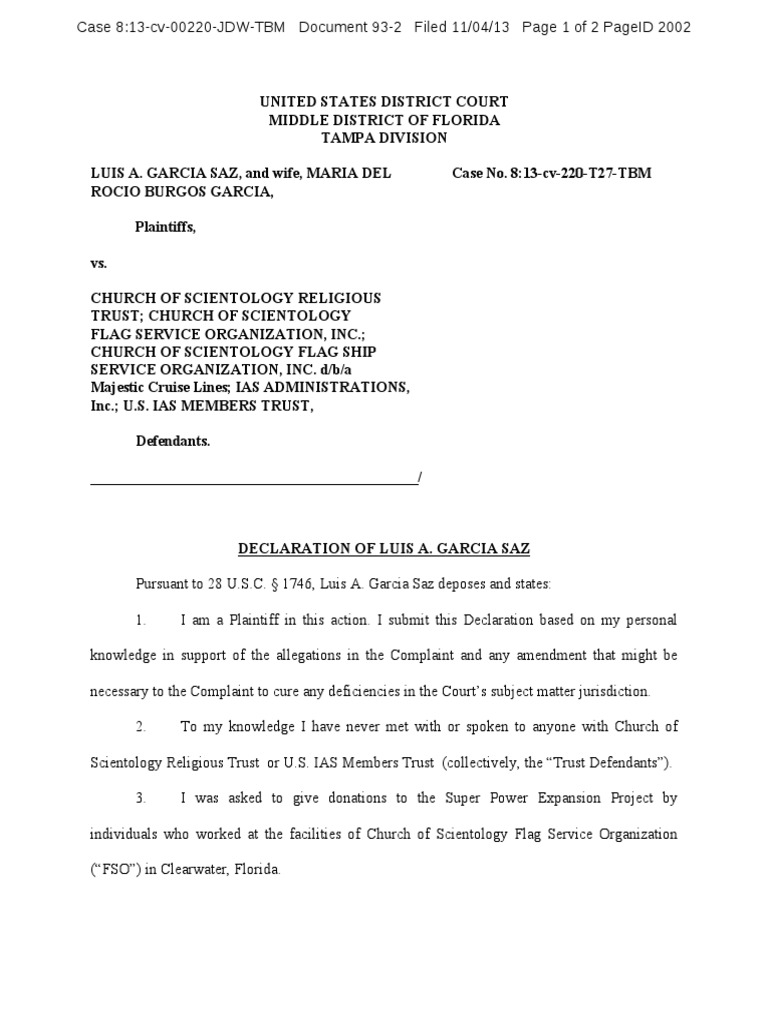 UNITED STATES DISTRICT COURT MIDDLE DISTRICT OF FLORIDA TAMPA DIVISION LUIS A. GARCIA SAZ, and wife, MARIA DEL Case No. 8:13-cv-220-T27-TBM ROCIO BURGOS GARCIA, Plaintiffs, vs. CHURCH OF SCIENTOLOGY RELIGIOUS TRUST; CHURCH OF SCIENTOLOGY FLAG SERVICE ORGANIZATION, INC.; CHURCH OF SCIENTOLOGY FLAG SHIP SERVICE ORGANIZATION, INC. d/b/a Majestic Cruise Lines; IAS ADMINISTRATIONS, Inc.; U.S. IAS MEMBERS TRUST, Defendants. / DECLARATION OF LUIS A. GARCIA SAZ