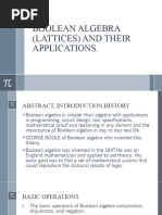 Jump to: navigation, search For an introduction to the subject, see Boolean algebra#Boolean algebras. For the elementary syntax and axiomatics of the subject, see Boolean algebra. For an alternative presentation, see Boolean algebras canonically defined. It has been suggested that two-element Boolean algebra be merged into this article or section. (Discuss) Proposed since April 2011. In abstract algebra, a Boolean algebra or Boolean lattice is a complemented distributive lattice. This type of algebraic structure captures essential properties of both set operations and logic operations. A Boolean algebra can be seen as a generalization of a power set algebra or a field of sets. It is also a special case of De Morgan algebra and Kleene algebra.