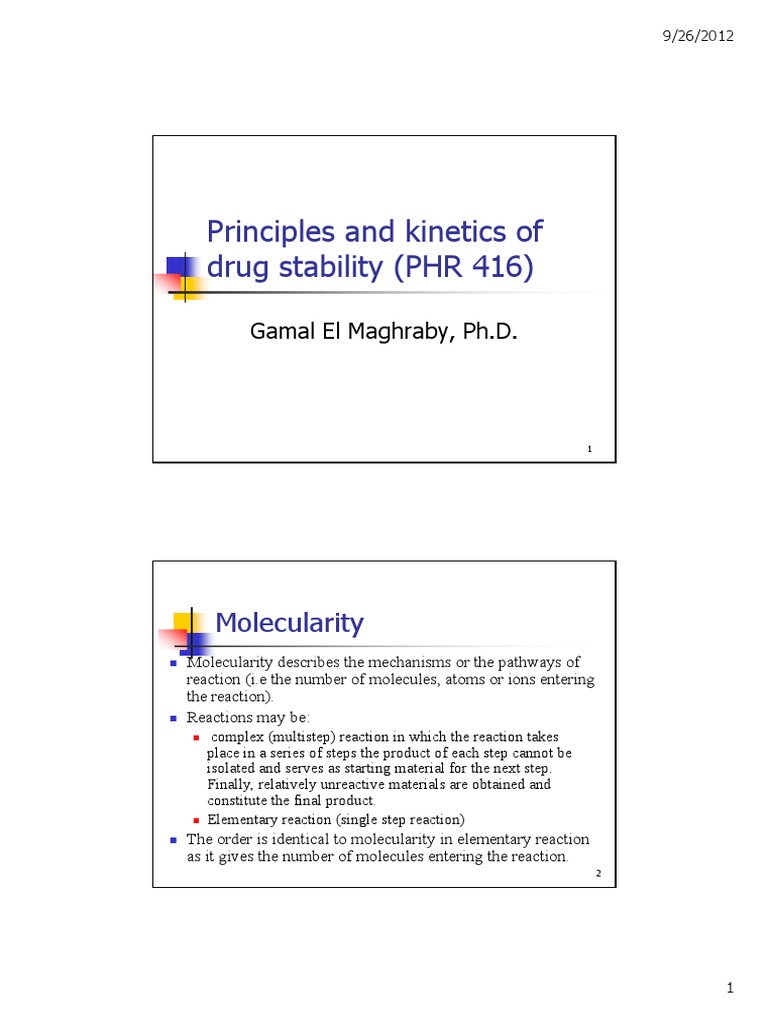 The important point is that the amount of drug in solution remains constant despite its decomposition with time. The reservoir of solid drug is responsible for this consistency Apparent zero order. In absence of reservoir particles, the drug is depleted with time and the reaction is first order which can be described using the following equation: