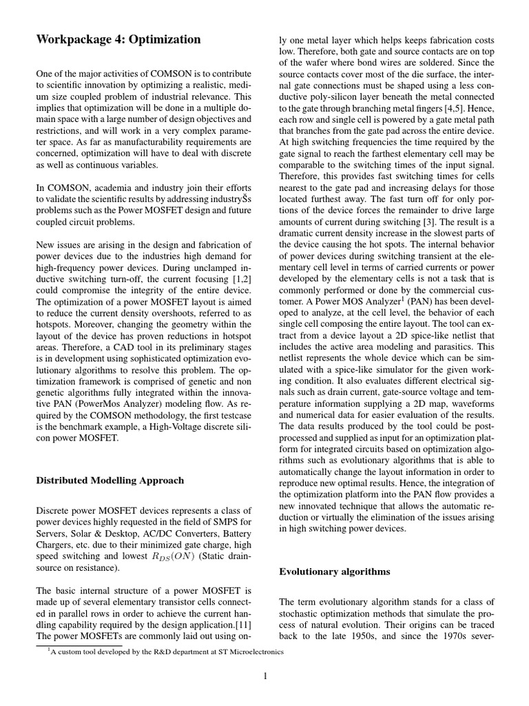One of the major activities of COMSON is to contribute to scientic innovation by optimizing a realistic, medium size coupled problem of industrial relevance. This implies that optimization will be done in a multiple domain space with a large number of design objectives and restrictions, and will work in a very complex parameter space. As far as manufacturability requirements are concerned, optimization will have to deal with discrete as well as continuous variables. In COMSON, academia and industry join their efforts to validate the scientic results by addressing industrys problems such as the Power MOSFET design and future coupled circuit problems. New issues are arising in the design and fabrication of power devices due to the industries high demand for high-frequency power devices. During unclamped inductive switching turn-off, the current focusing [1,2] could compromise the integrity of the entire device. The optimization of a power MOSFET layout is aimed to reduce the current density overshoots, referred to as hotspots. Moreover, changing the geometry within the layout of the device has proven reductions in hotspot areas. Therefore, a CAD tool in its preliminary stages is in development using sophisticated optimization evolutionary algorithms to resolve this problem. The optimization framework is comprised of genetic and non genetic algorithms fully integrated within the innovative PAN (PowerMos Analyzer) modeling ow. As required by the COMSON methodology, the rst testcase is the benchmark example, a High-Voltage discrete silicon power MOSFET.